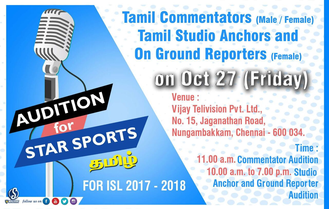 Supermachans Chennaiyin Fc Fans On Twitter Oct 27 Star Sports Tamil Auditions For Isl 2017 2018 1 Tamil Commentators 2 Studio Anchor On Ground Reporters Don T Miss This Opprtunity Https T Co Bjpwbz91lj - Were later renamed star sports 1 hindi and 1 tamil, respectively.) this was in contrast to hong kong, taiwan and southeast asia, where fox international channels asia pacific relaunched espn as fox sports on 28 january 2013,1213 and rebranded.